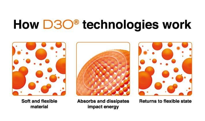 D3O® offers the thinnest and most advanced protection against impact. The market-defining products containing D3O are used worldwide by soldiers, professional athletes, industrial workers and people like us. By using D3O In the products it means a slimmer, lower profile material can be used to achieve optimal impact absorption results over other products on the market.